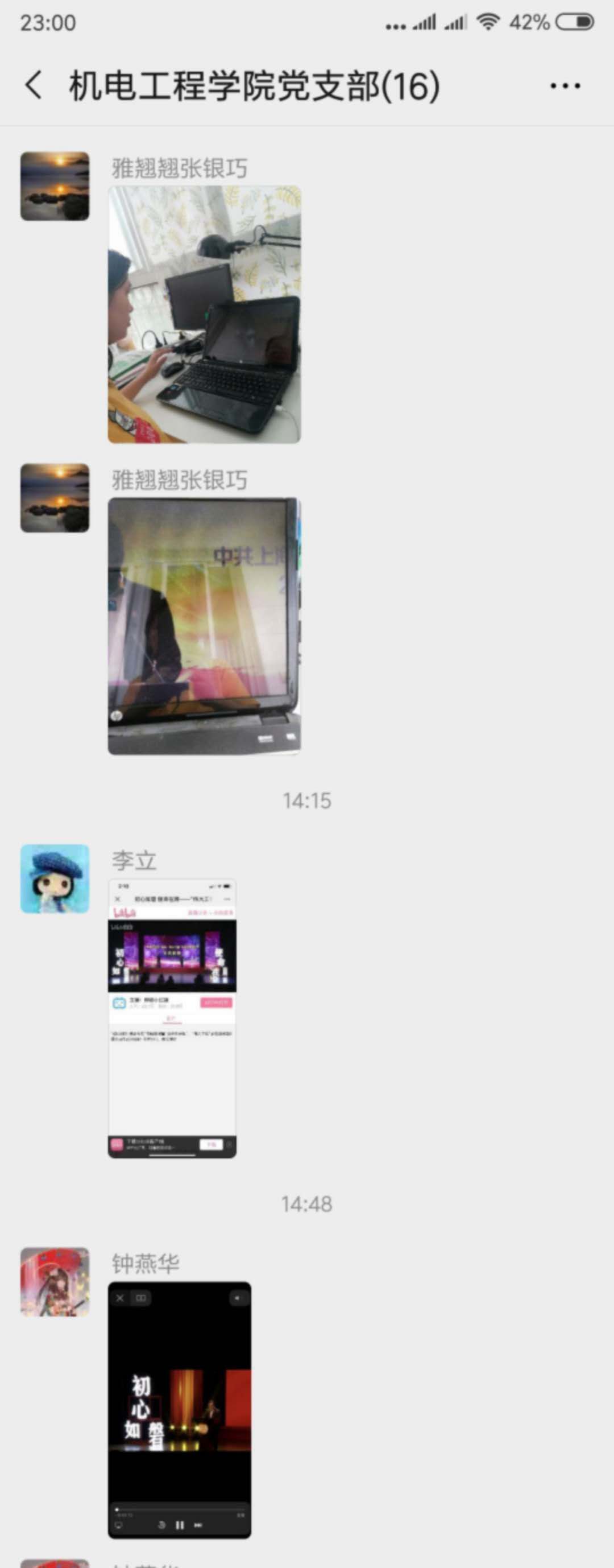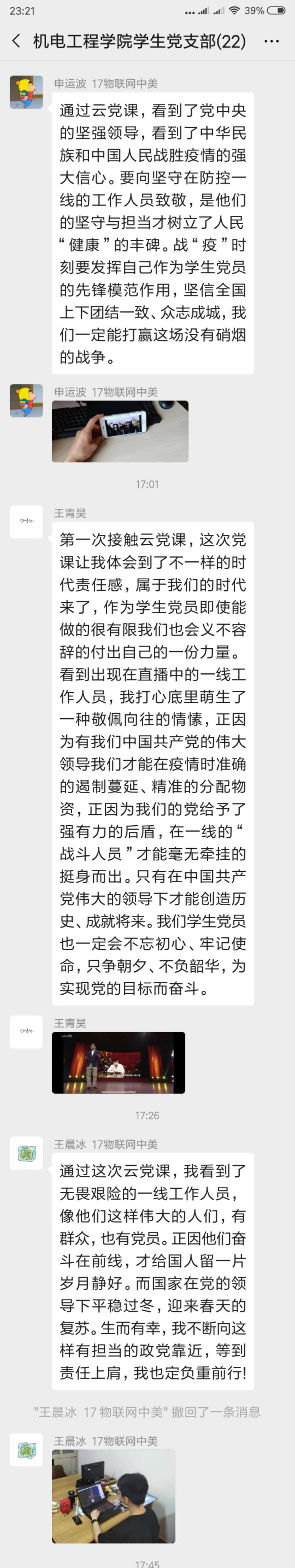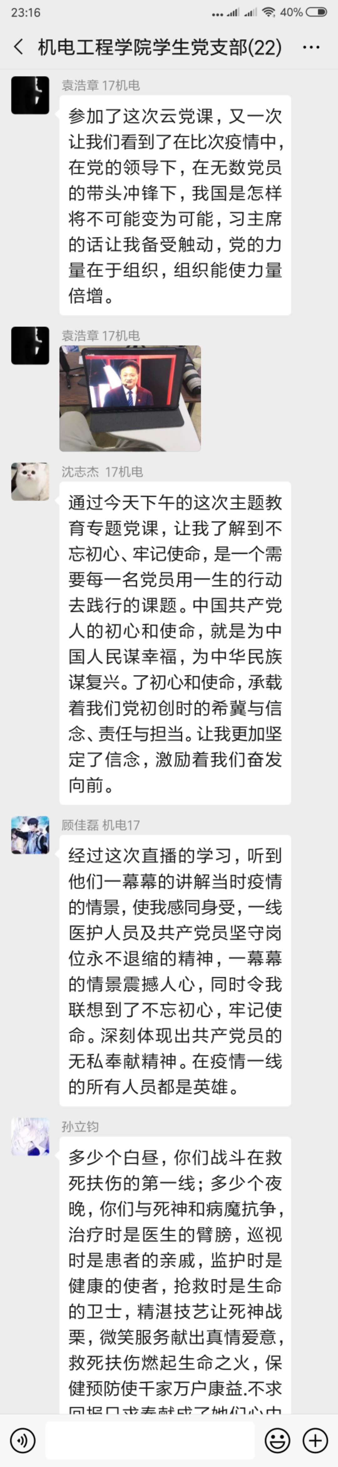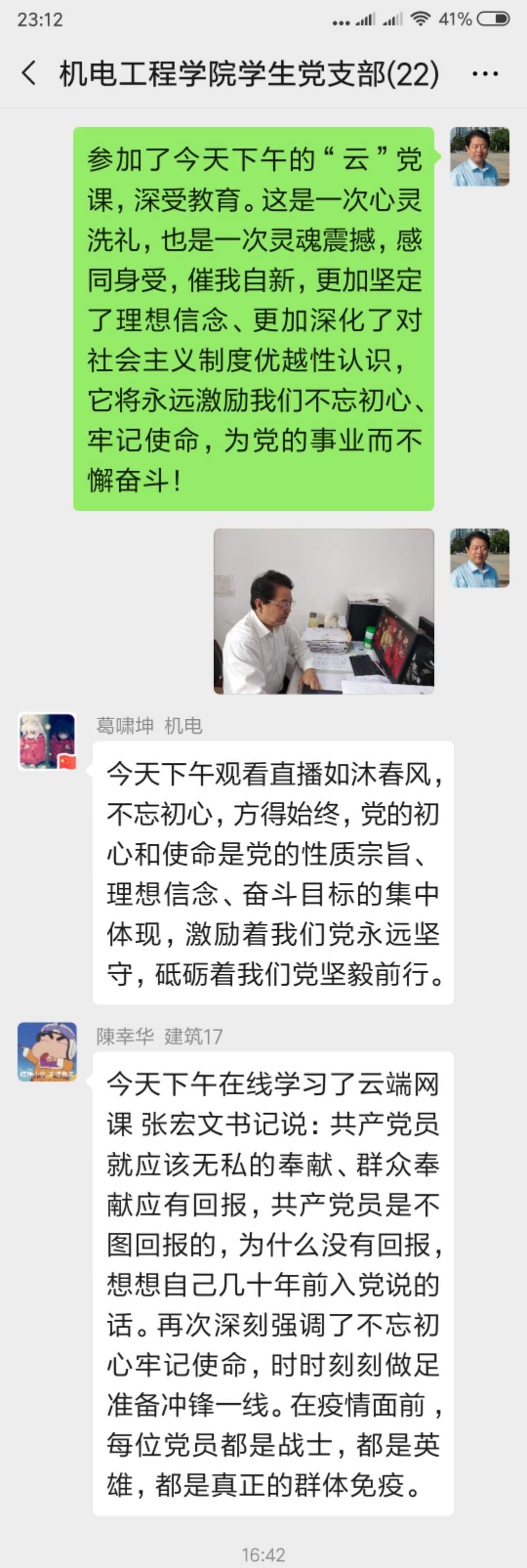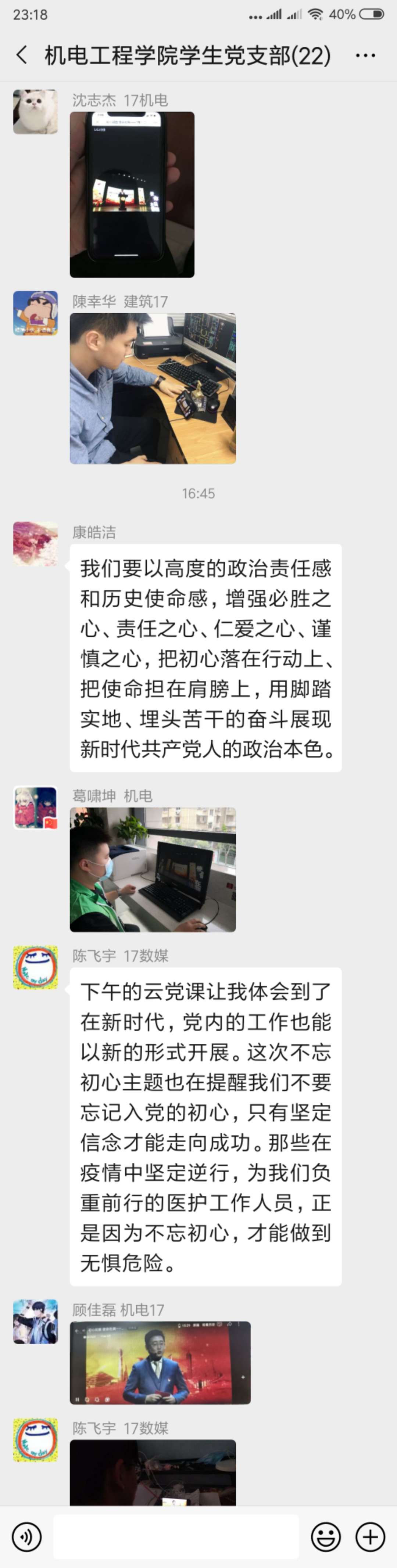 课后,机电师生党员纷纷在微信群里发图片、谈感想、讲心得。现辑录如下,以飨读者。