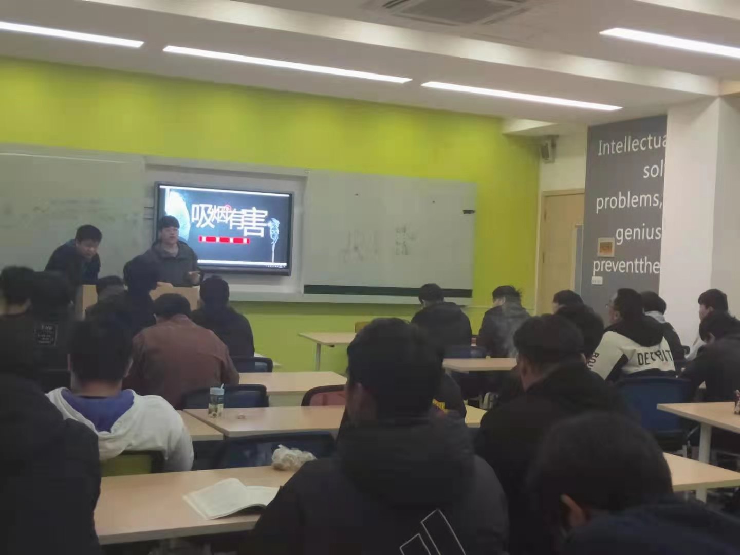 20级数字媒体1班本次主题班会内容主要围绕“被动吸烟的危害”,“有损文明行为”、“易引发校园火灾”等安全隐患开展。