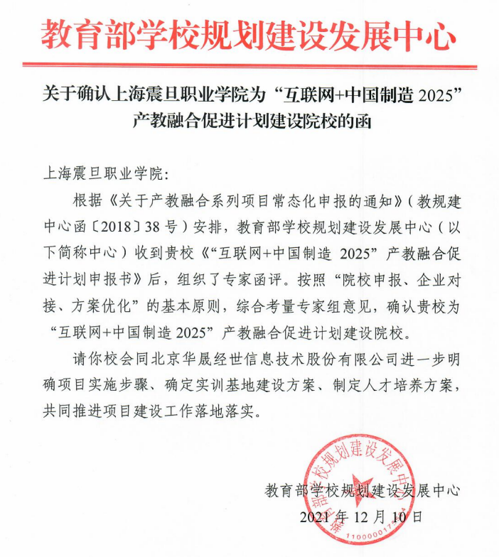 2021年12月10日,教育部学校规划建设发展中心经过专家函评,在基于“院校申报、企业对接、方案优化”的原则上,确认上海震旦职业学院为“互联网+中国制造2025”产教融合促进计划建设院校。据悉,上海震旦职业学院为上海地区首个申报成功“互联网+中国制造2025”产教融合项目的民办职业院校。