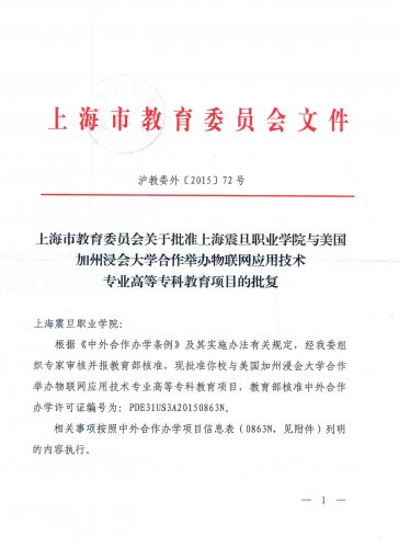 在全球经济一体化、科技与信息迅速发展的今天,国际化已经成为教育发展的趋势,也是我院职业教育适应经济发展和国家“走出去”发展战略的必然选择。我院在董事长、院长和党委书记的领导下,经过杜飞龙院长具体指导和机电工程学院、国际交流处等有关部门领导和同仁的努力,积极申报上海震旦职业学院与美国加州浸会大学合作举办物联网应用技术专业高等专科教育项目。在申报过程中学习其他高校办学经验,与浸会大学沟通联系,反复修改项目方案,终于在 2015年9月30日获上海市教育委员会批准和教育部核准。中外合作办学许可证编号为:PDE31US3A20150863N。