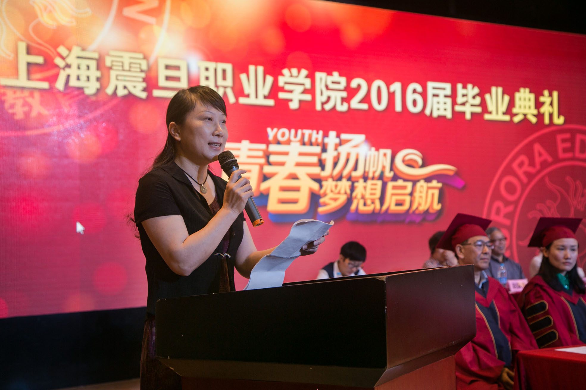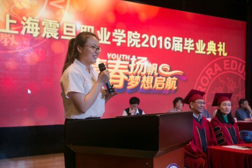 上海市优秀毕业生马丽娜代表2016届毕业生发言。首先她代表所有毕业生表达了对母校、老师和辅导员的感激之情,并表示“将继承和发扬震旦精神,用在校学到的知识去创新创业,开创美好的未来。”
