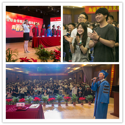 授证仪式后,在马丽娜同学的领誓下,全体毕业生们集体宣誓:“牢记震旦校训:崇尚科学,注重文艺,不讲教理。忠于祖国、热爱人民、用聪慧和才智奉献社会,以品格和精神影响他人,实现成才报国的梦想,实现中华民族的伟大复兴。”宣誓后,热情高涨的毕业生在陈院长的带领下高唱《毕业歌》,2016届毕业典礼在