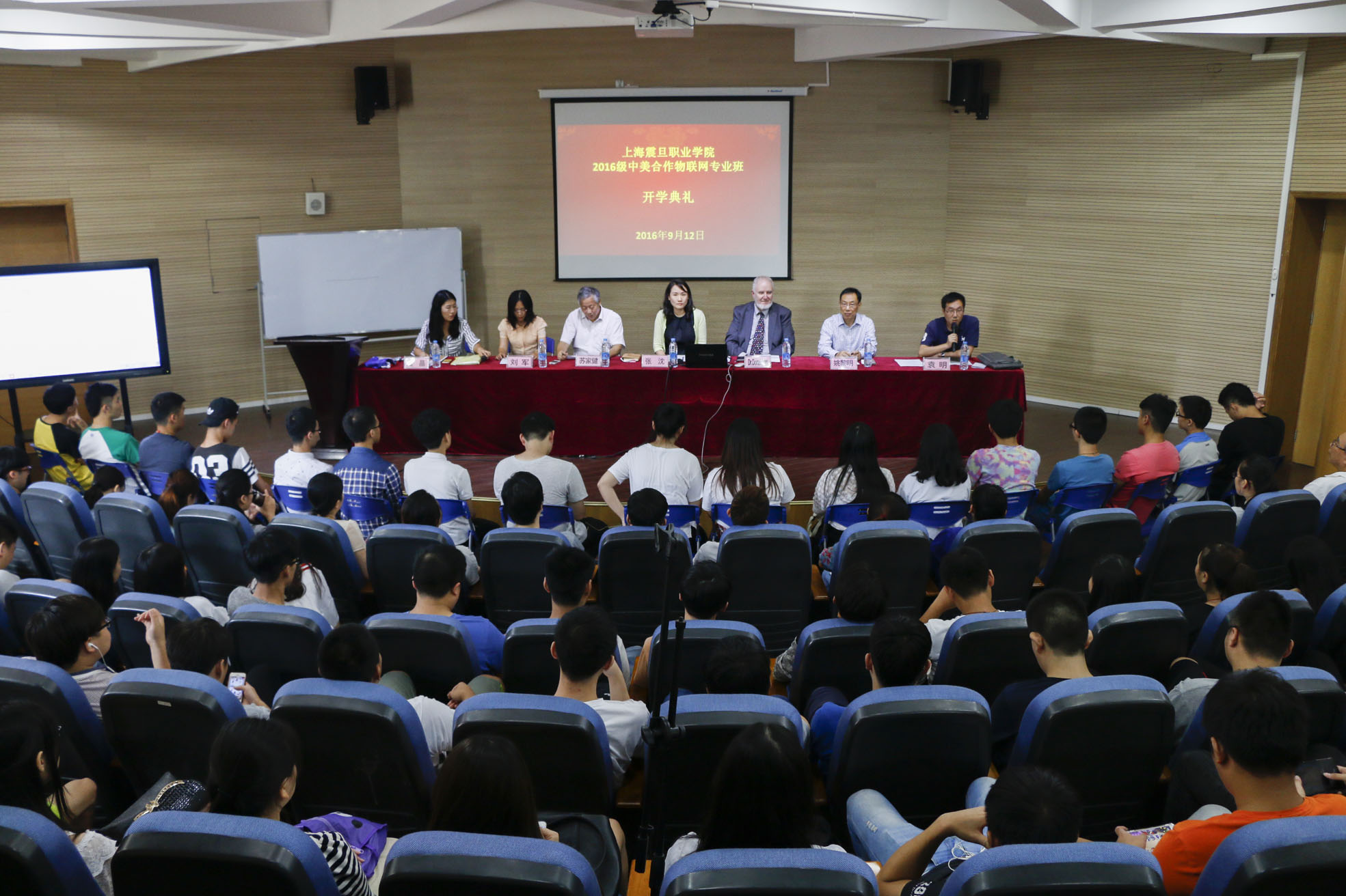 丹桂飘香的朗朗金秋,机电学院又迎来了一个开学季。9月12日下午,来自五湖四海的莘莘学子怀着对大学的憧憬,齐聚上海震旦职业学院体艺楼一楼报告厅,上海震旦职业学院董事长兼副院长、中美合作项目负责人张沈老师、美国浸会大学工程学院Dr.Donaldson、机电工程学院院长苏家健教授、副院长姚黎明教授、国际交流学院院长兼基础部主任刘军老师、国际英语教研室副主任王斌老师出席了2016级中美合作物联网专业新生开学典礼,开学典礼由袁明老师主持。
